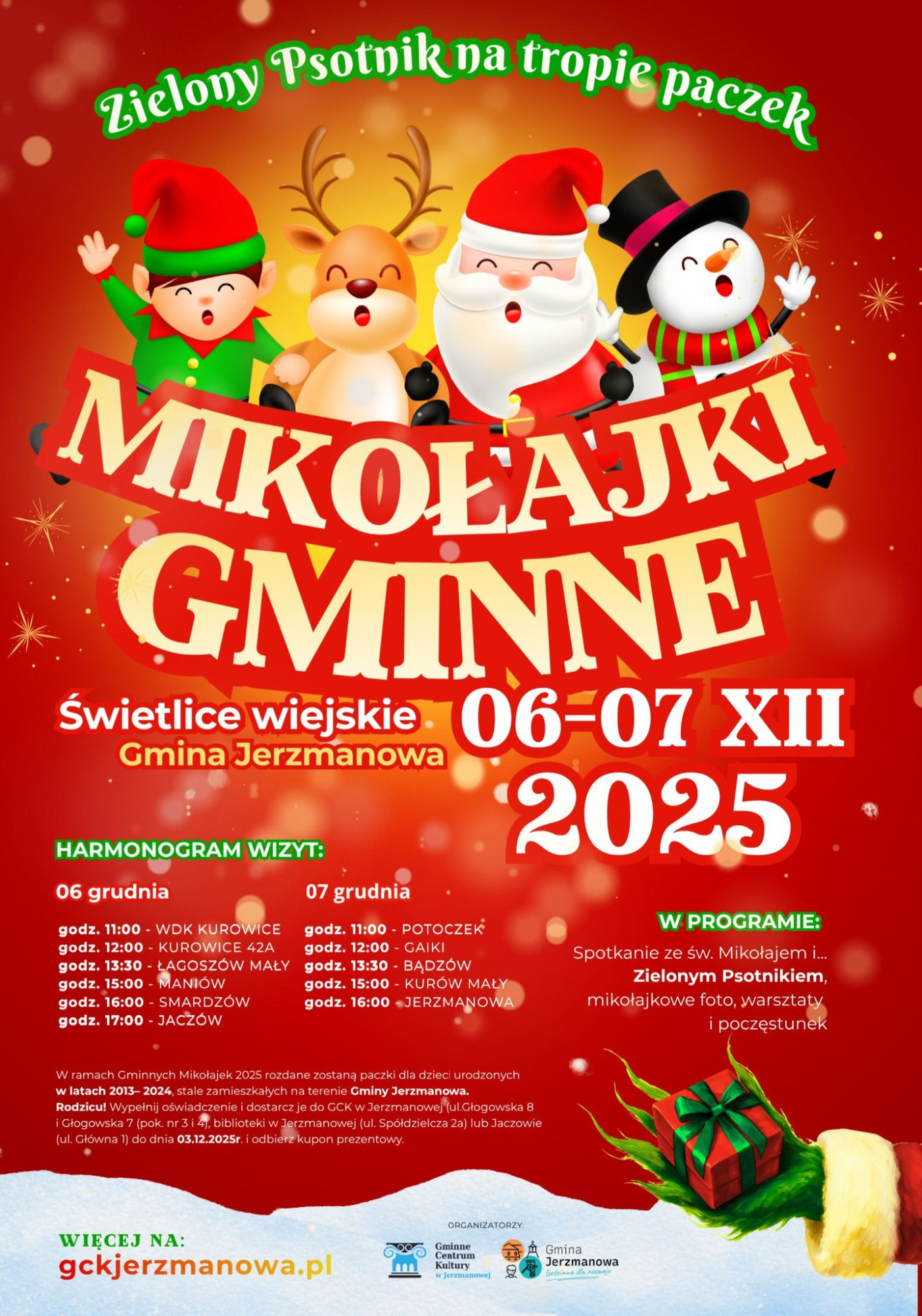 Anna Obolewicz, wójt gminy Jerzmanowa, wraz z Gminnym Centrum Kultury zapraszają dzieci i mieszkańców na wyjątkowe Gminne Mikołajki – „Zielony Psotnik na tropie paczek”. Dwudniowe wydarzenie odbędzie się 6 i 7 grudnia 2025 roku w świetlicach wiejskich całej gminy.
