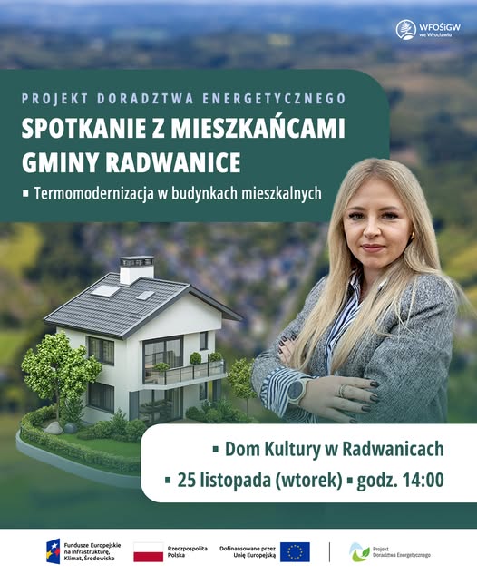 We wtorek, 25 listopada, przedstawiciele Wojewódzkiego Funduszu Ochrony Środowiska i Gospodarki Wodnej we Wrocławiu odwiedzą Gminę Radwanice. Podczas spotkania informacyjnego doradczyni energetyczna Alicja Czarkowska przedstawi mieszkańcom najważniejsze zagadnienia związane z termomodernizacją budynków mieszkalnych.