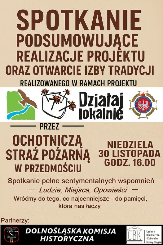 Ochotnicza Straż Pożarna w Przedmościu zaprasza mieszkańców i sympatyków na wyjątkowe spotkanie podsumowujące realizację projektu w ramach programu Działaj Lokalnie. Wydarzenie odbędzie się w niedzielę, 30 listopada, o godz. 16:00 i połączone będzie z uroczystym otwarciem Izby Tradycji OSP Przedmoście.