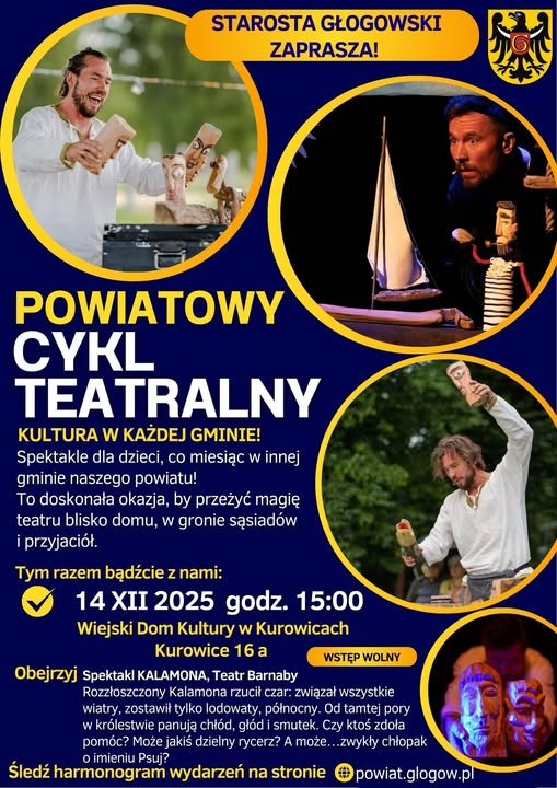 W najbliższą niedzielę w gminie Jerzmanowa odbędzie się kolejne spotkanie z teatrem w ramach Powiatowego Cyklu Teatralnego „Kultura w każdej gminie”! Zapraszamy 14 grudnia o godz. 15:00 do Wiejskiego Domu Kultury w Kurowicach na spektakl „KALAMONA” w wykonaniu Teatru Barnaby – wstęp wolny!