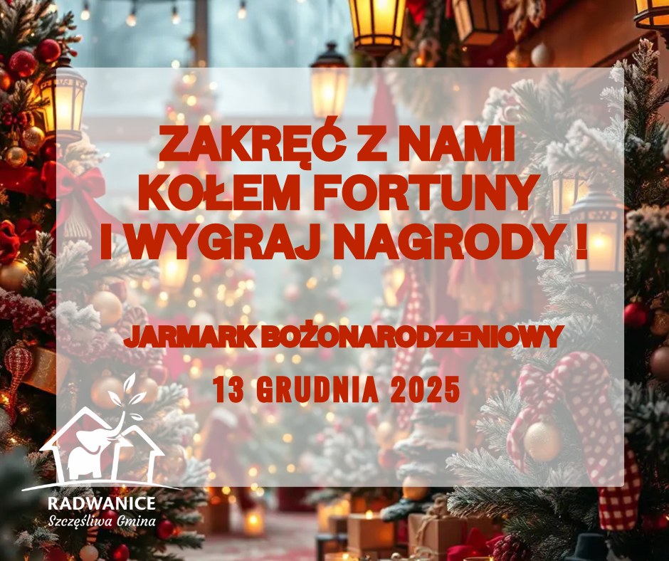 Gmina Radwanice zaprasza na Jarmark Bożonarodzeniowy 13 grudnia. Na Jarmarku czeka na Państwa mnóstwo atrakcji, a wśród nich nasze Koło Fortuny!Serdecznie zapraszamy do stoiska promocyjnego Gminy Radwanice. Zasady są proste: zakręć Kołem Fortuny, odpowiedz na pytanie, odbierz nagrodę! To co… widzimy się na Jarmarku?