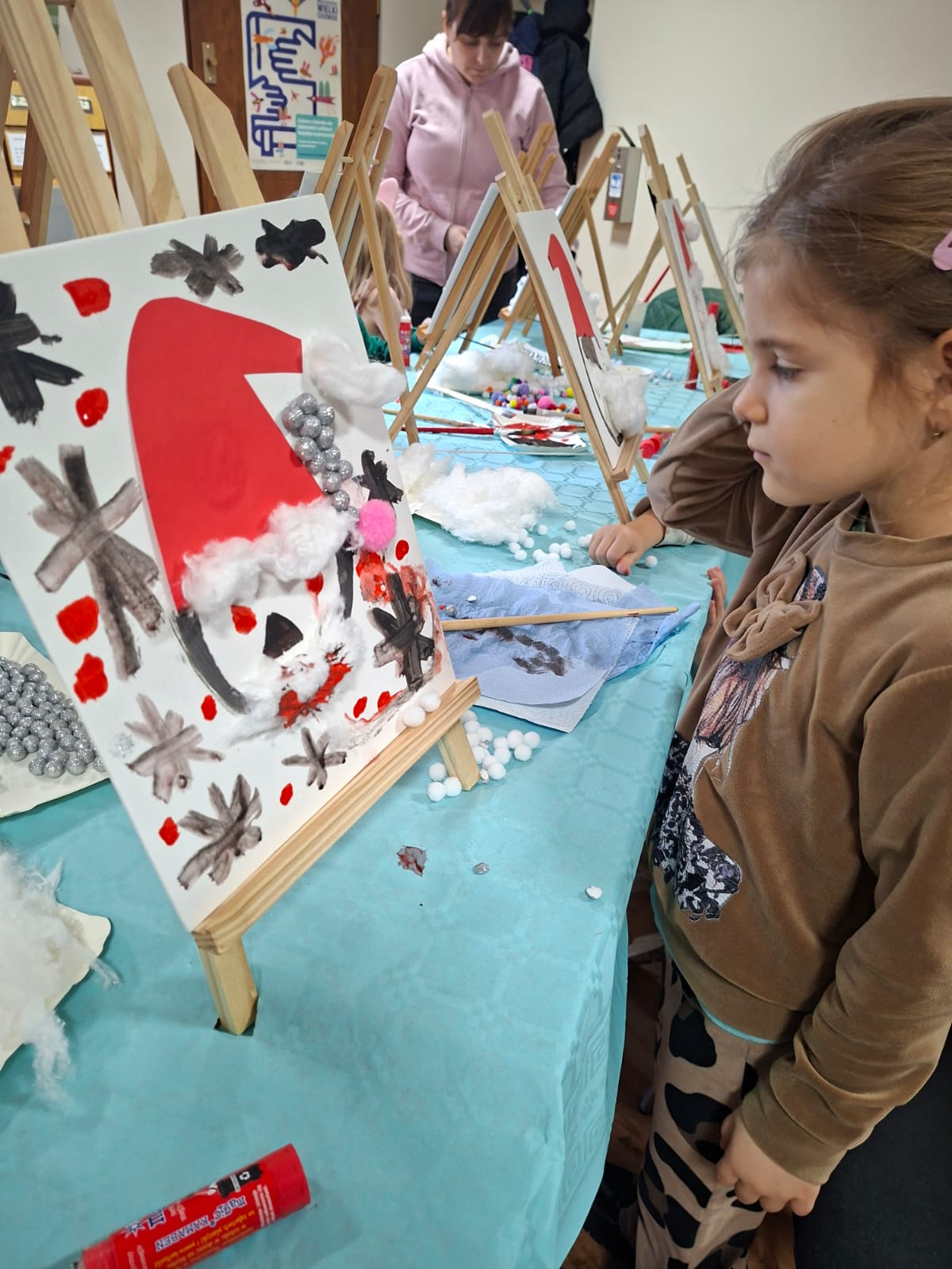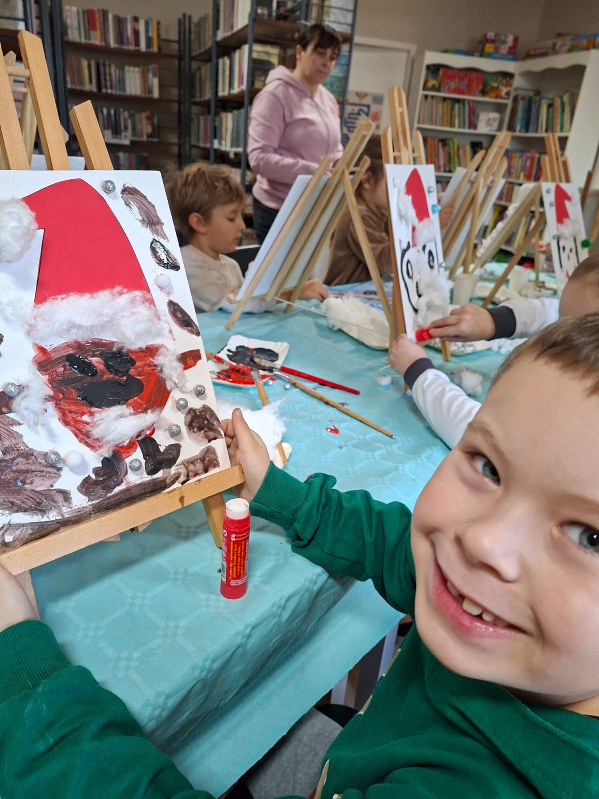 Najmłodsi uczestnicy brali udział w warsztatach dekorowania pierniczków oraz tworzenia zawieszek choinkowych z kolorowych drucików kreatywnych. Zajęcia te nie tylko rozwijały wyobraźnię i zdolności manualne, ale także sprzyjały wspólnemu, radosnemu spędzaniu czasu. Równie aktywnie było w filiach biblioteki. Przedszkolaki malowały portrety św. Mikołaja na sztalugach, natomiast uczniowie klas pierwszych dekorowali pachnące pierniki, ucząc się cierpliwości i precyzji poprzez zabawę.