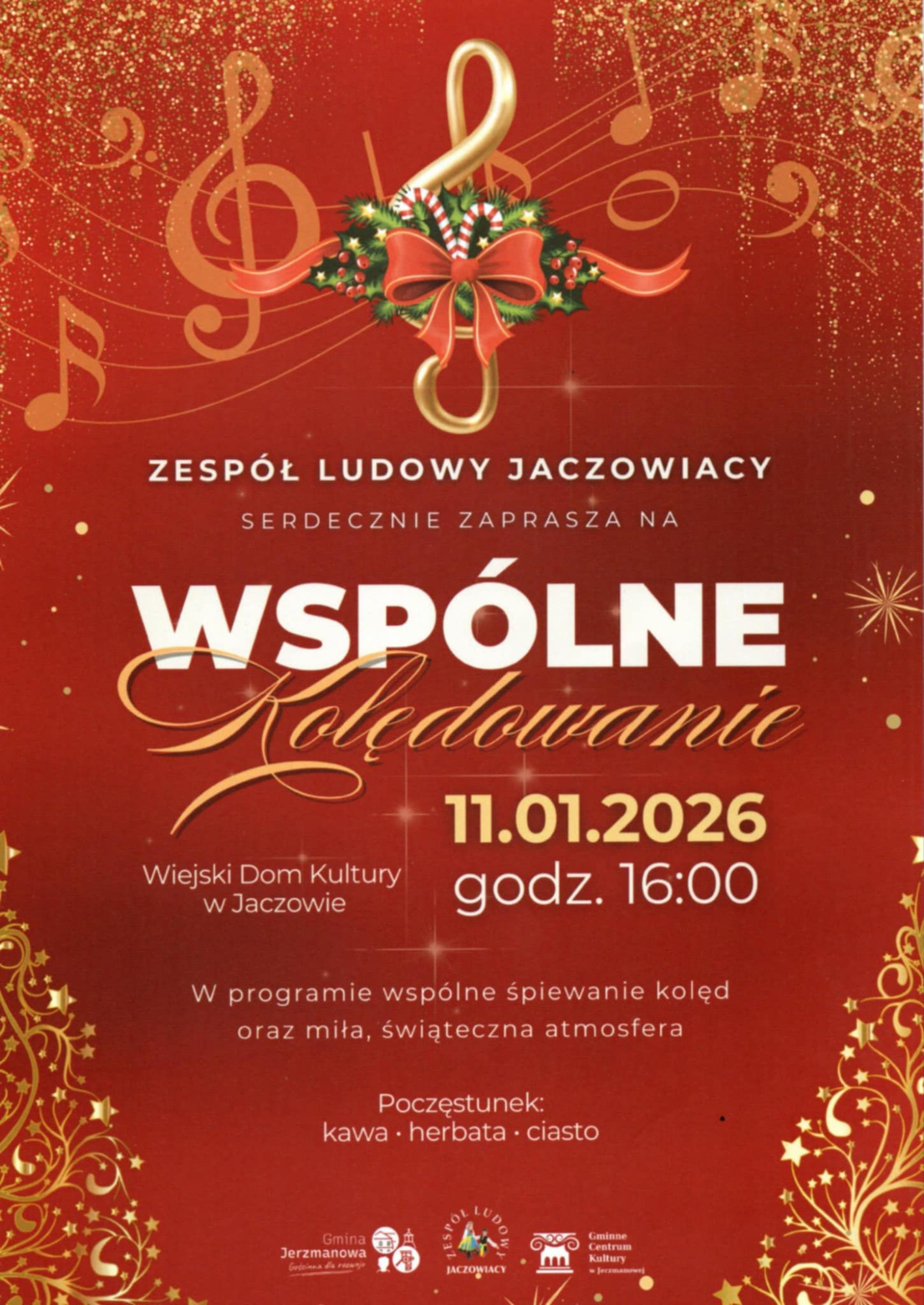 Zespół Ludowy Jaczowiacy zaprasza mieszkańców oraz gości na Wspólne Kolędowanie, które odbędzie się 11 stycznia (niedziela) o godz. 16.00 w Wiejskim Domu Kultury w Jaczowie.