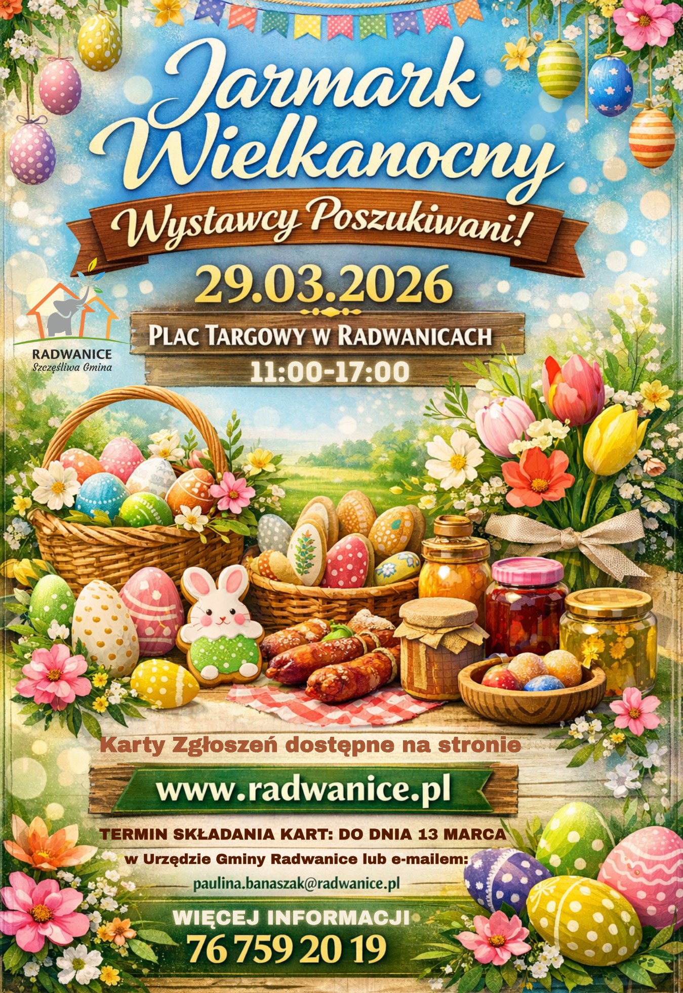 Udział wystawców w jarmarku jest bezpłatny. Zgłoszenia przyjmowane są do 13 marca 2026 roku. Karty zgłoszeniowe dostępne są na stronie internetowej www.radwanice.pl oraz w komentarzu pod postem informacyjnym.