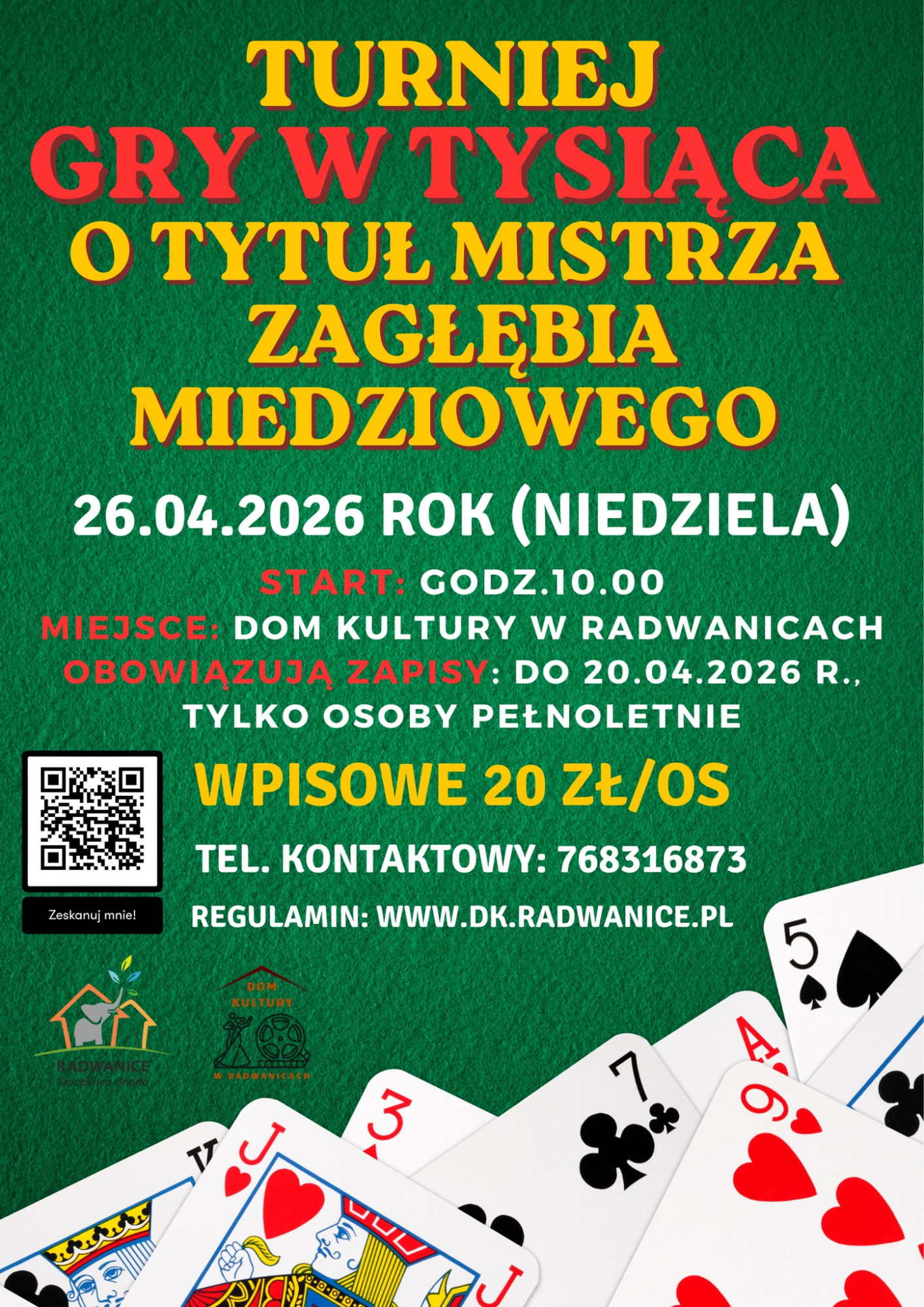 Miłośnicy gier karcianych będą mieli niepowtarzalną okazję sprawdzić swoje umiejętności podczas Turnieju Gry w Tysiąca o tytuł Mistrza Zagłębia Miedziowego. Wydarzenie odbędzie się 26 kwietnia 2026 roku (niedziela) w Domu Kultury w Radwanicach.