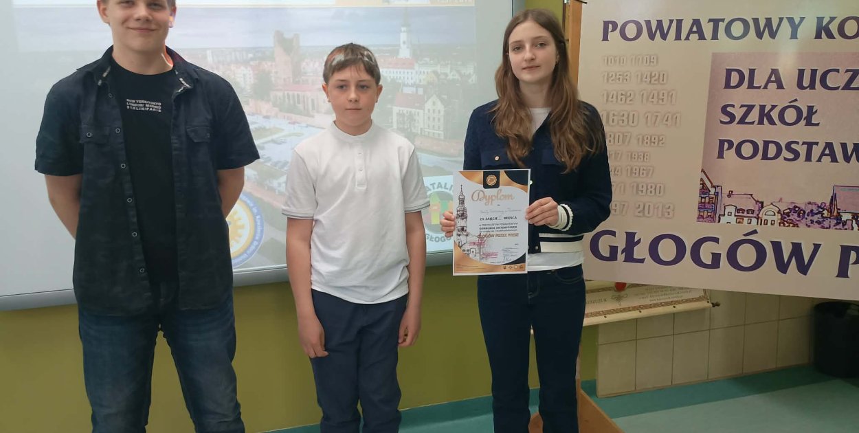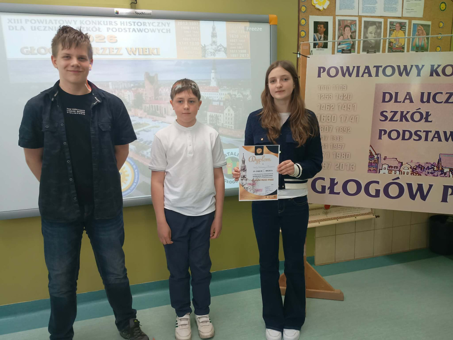 Placówkę reprezentowali Zuzanna Gawlik, Dawid Kozłowski oraz Krzysztof Myśliwiec. Młodzi uczestnicy wykazali się imponującą wiedzą na temat historii Głogowa – od znajomości zabytków i topografii miasta po lokalne legendy. Konkurs stał na wysokim poziomie, a rywalizacja była wyrównana i prowadzona w duchu fair play.