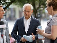 Trwa spotkanie przedstawicieli Platformy Obywatelskiej z głogowianami. Rozmawiają wspólnie w Parku Słowiańskim. Są media lokalne, regionalne,