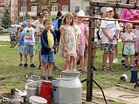 Na boisku sportowym w Kotli mieszkańcy gminy świętują tegoroczne dożynki. Choć w całym regionie pada deszcz, tutaj pogoda pozwoliła na wspólne świętowanie. Inaczej było podczas żniw – rolnicy musieli zmagać się ze zmienną aurą, która utrudniała zbiór plonów.